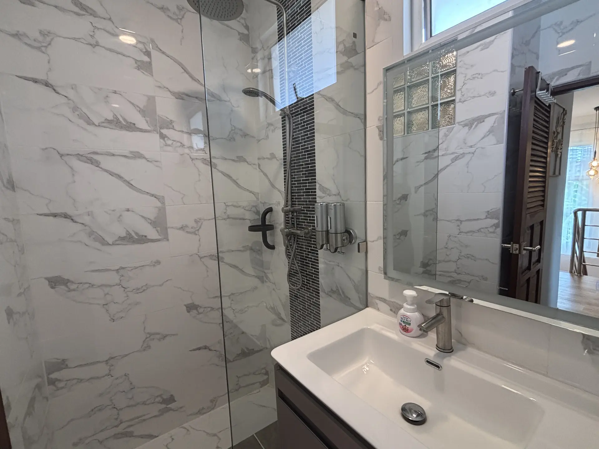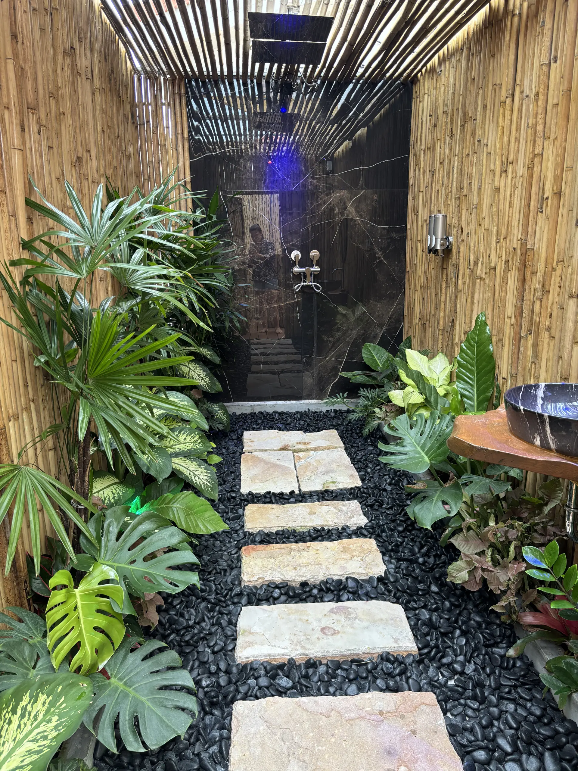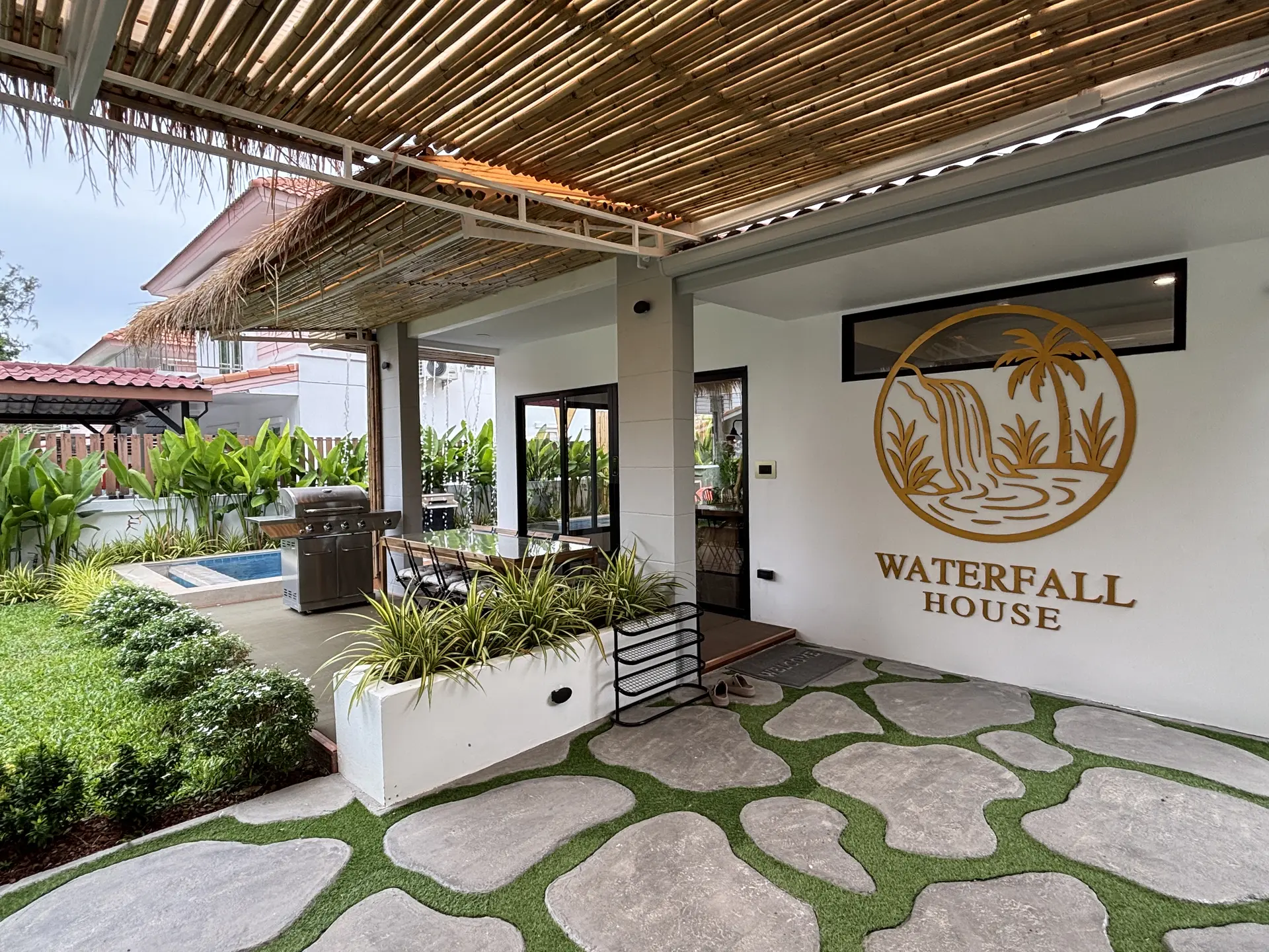 Set on a walled and landscaped garden, the property features a beautiful swimming pool with a waterfall, creating a perfect tropical ambiance.